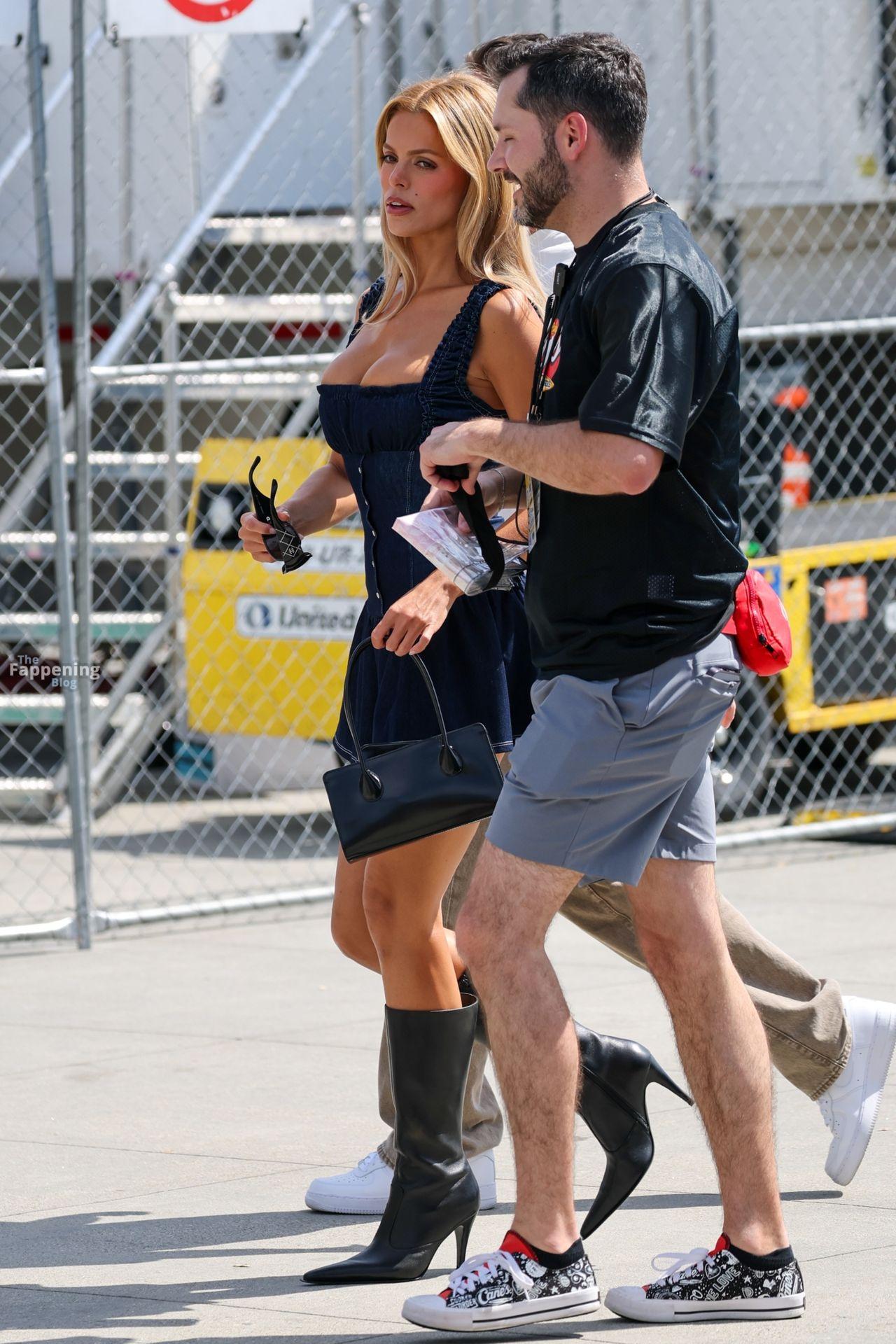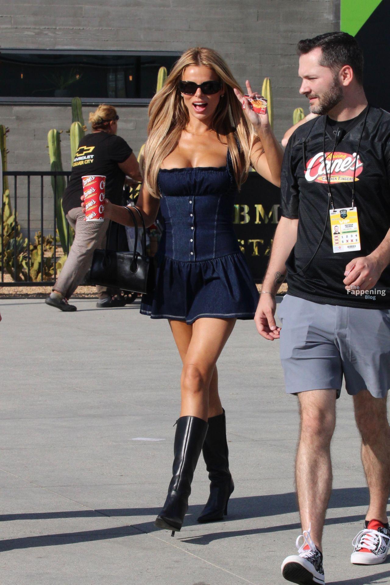 Brooks Nader is seen leaving the Fanatics Flag Football game, walking out pantyless in a denim short dress paired with long black boots and sunglasses as she heads out after the event.