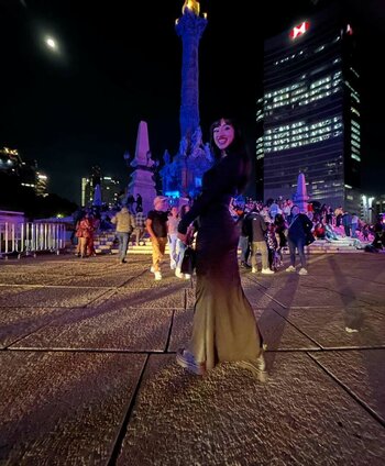 Pictures of a woman fully clothed with a full, dark-coloured dress on.
