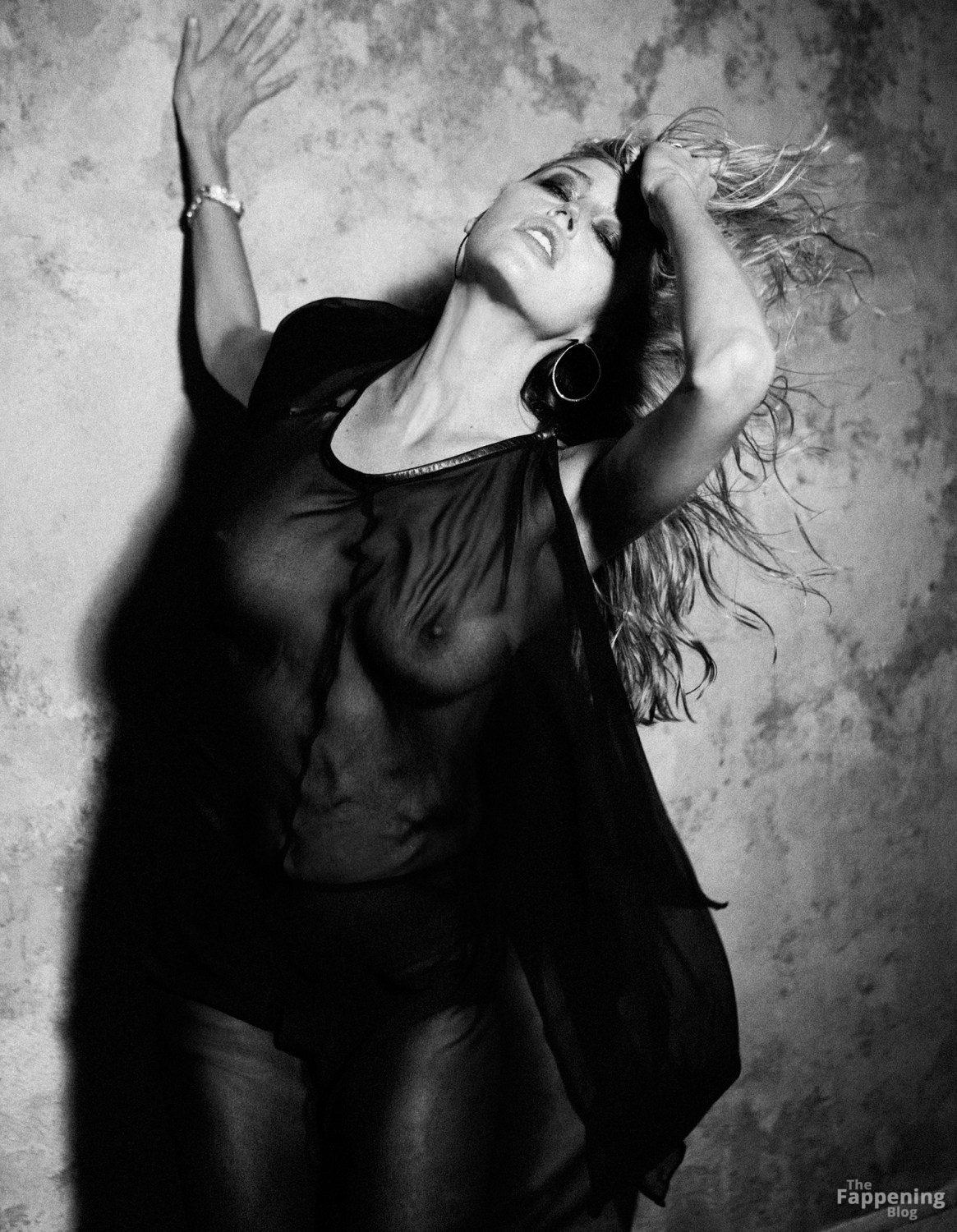 Fashion model and actress Estella Warren bares her nude tits, posin’ in a sheer dress.