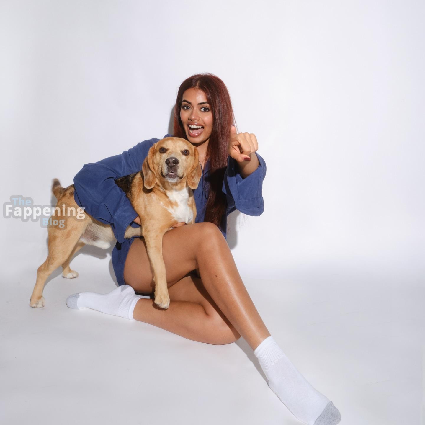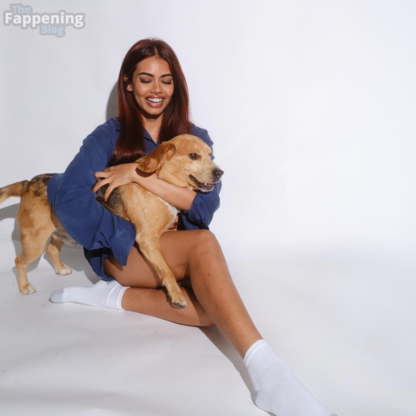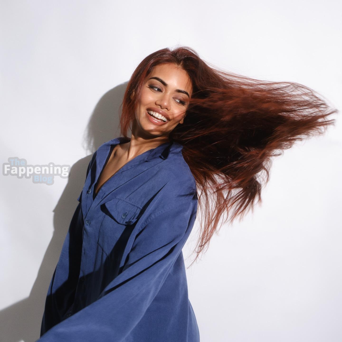 You’ve got to see Megan Suri’s new studio photos and videos. The actress looks absolutely effortless in an oversized blue denim shirt and white socks, lounging on the floor with her vibrant red hair cascading down.