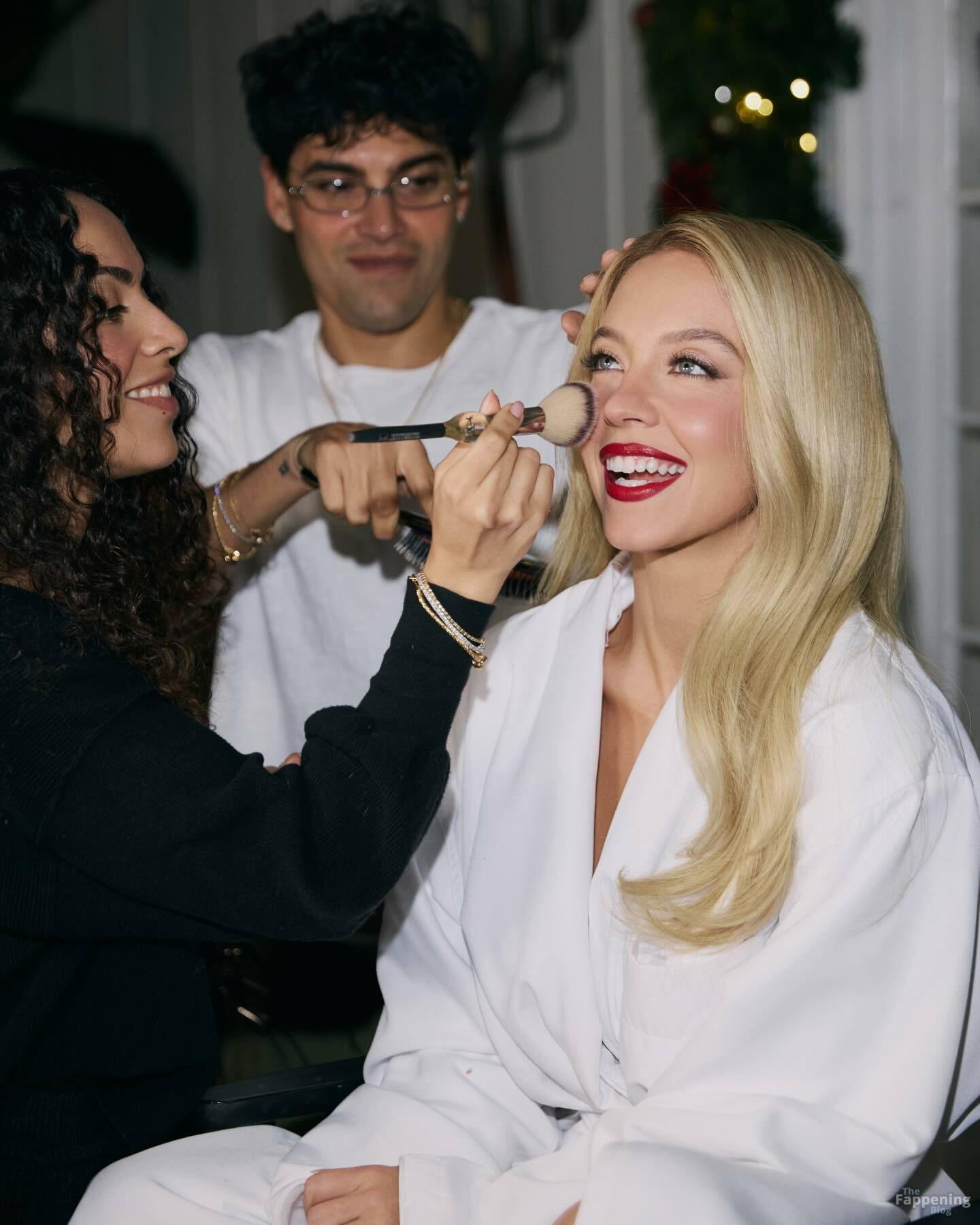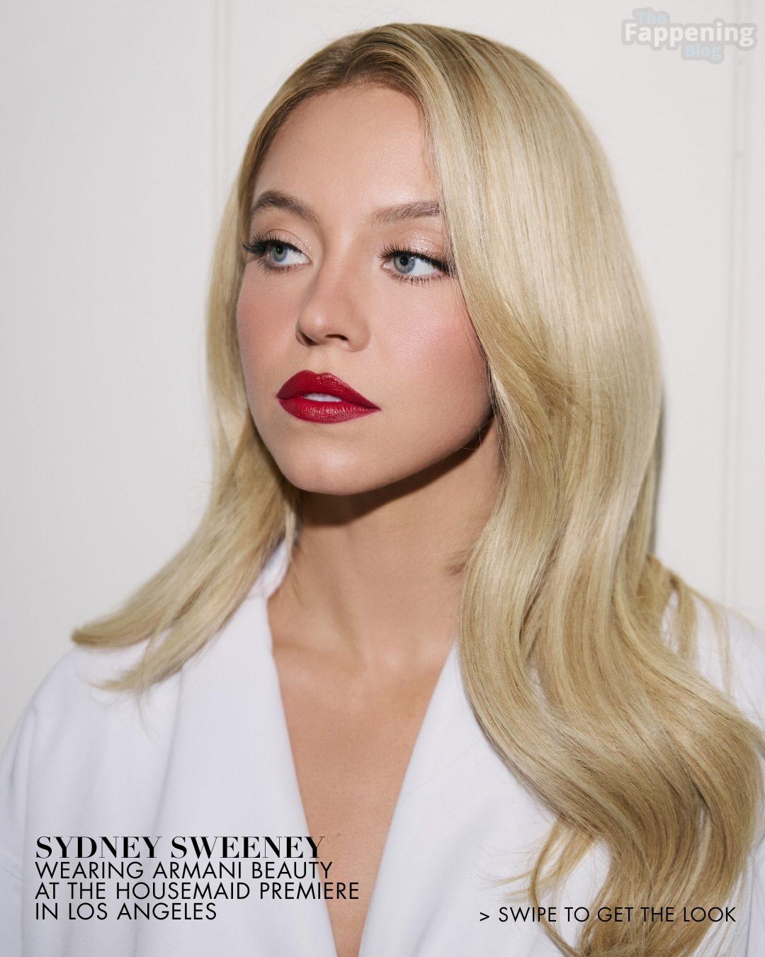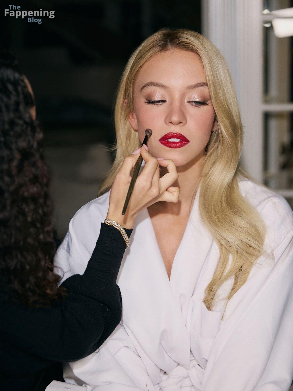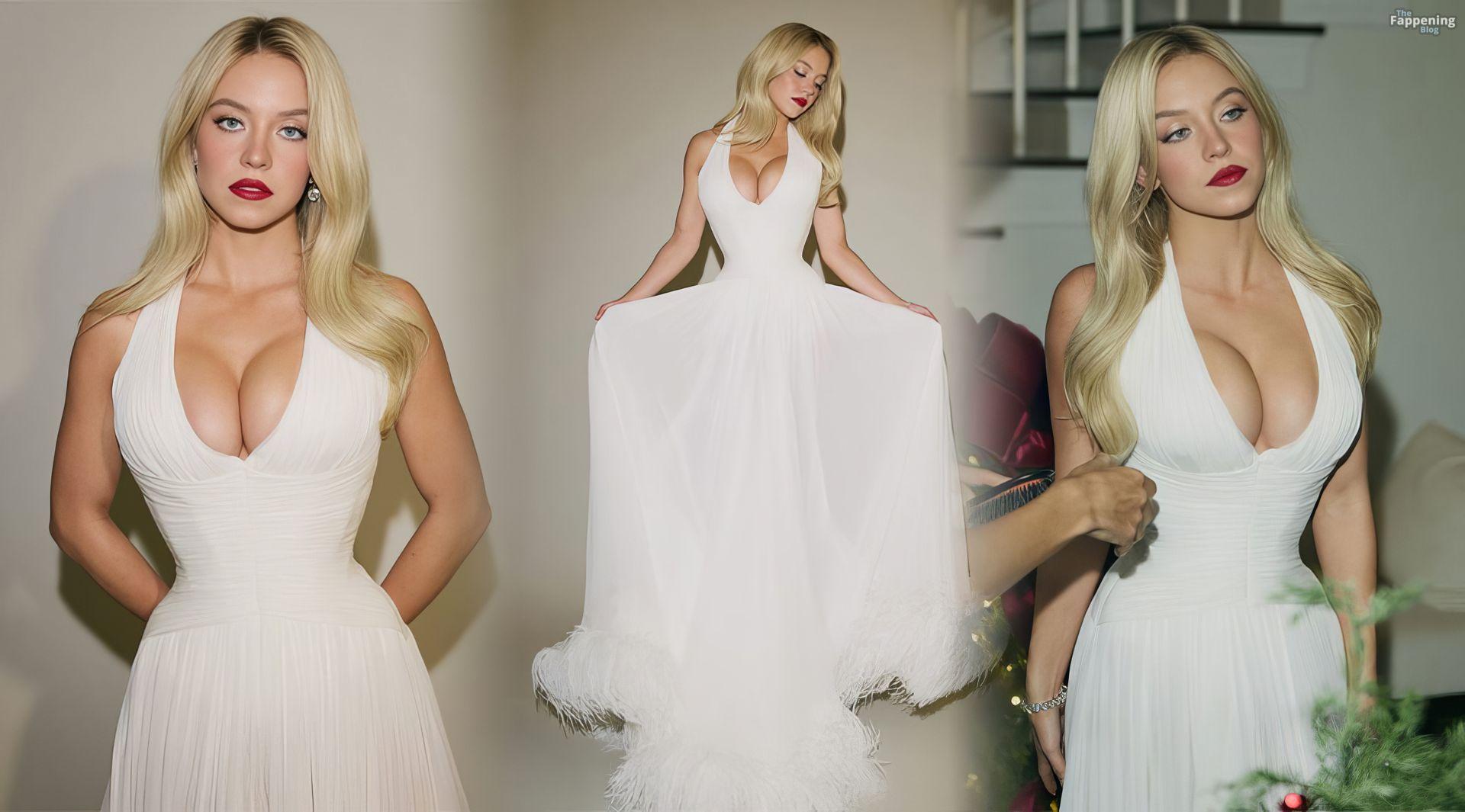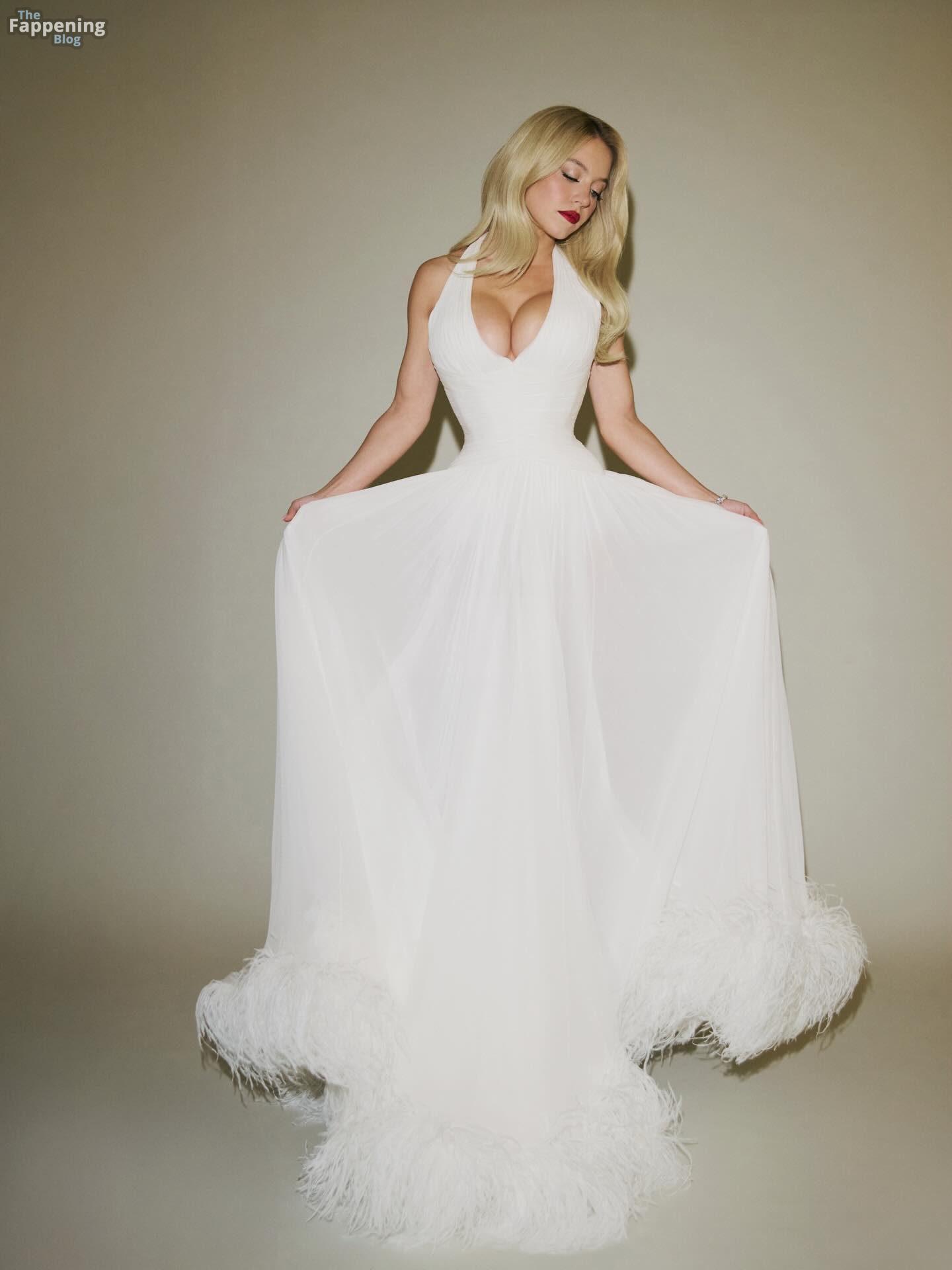 Sydney Sweeney displays her tits, posin’ in a plunging white dress for Sarah Krick’s shoot before the main event.
