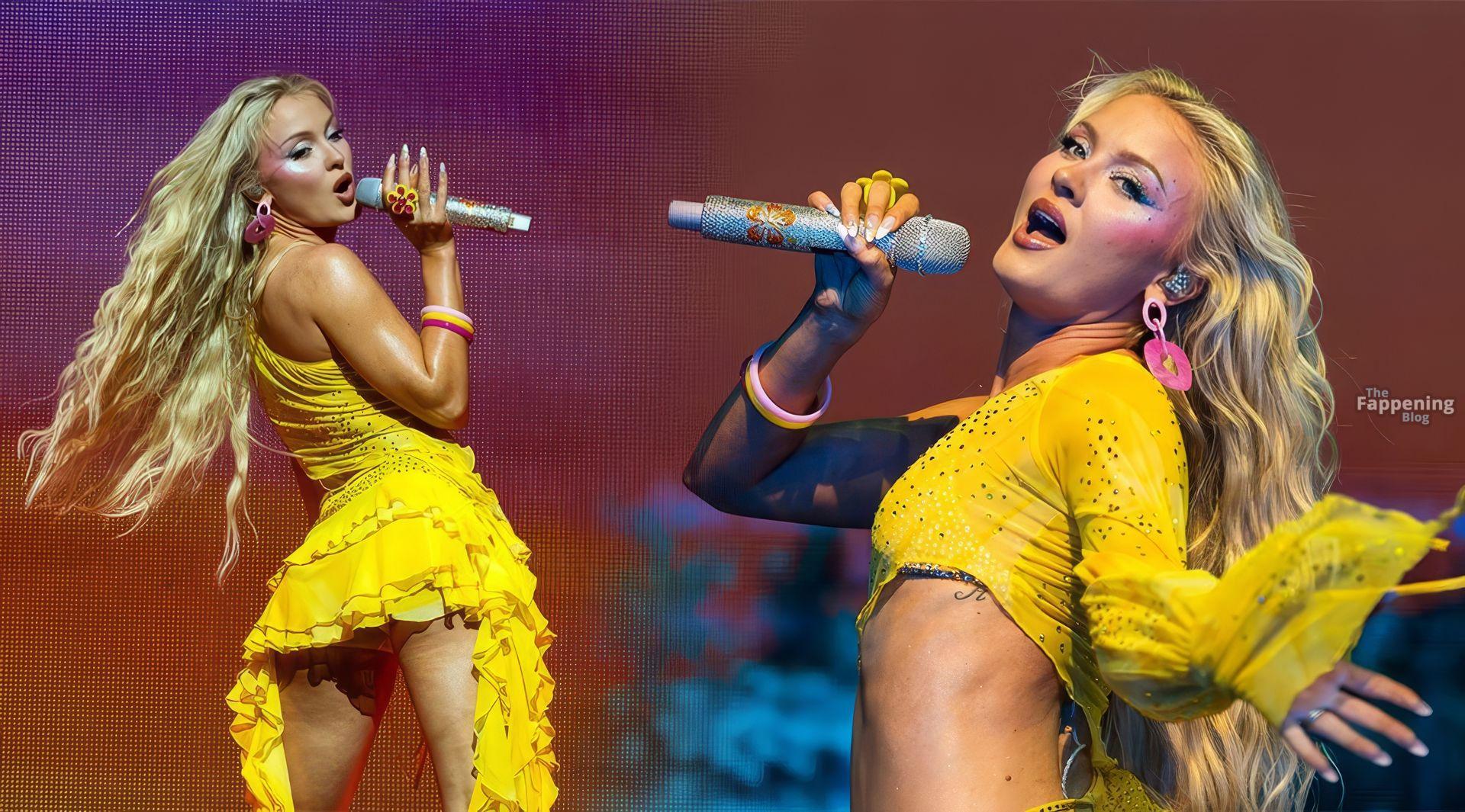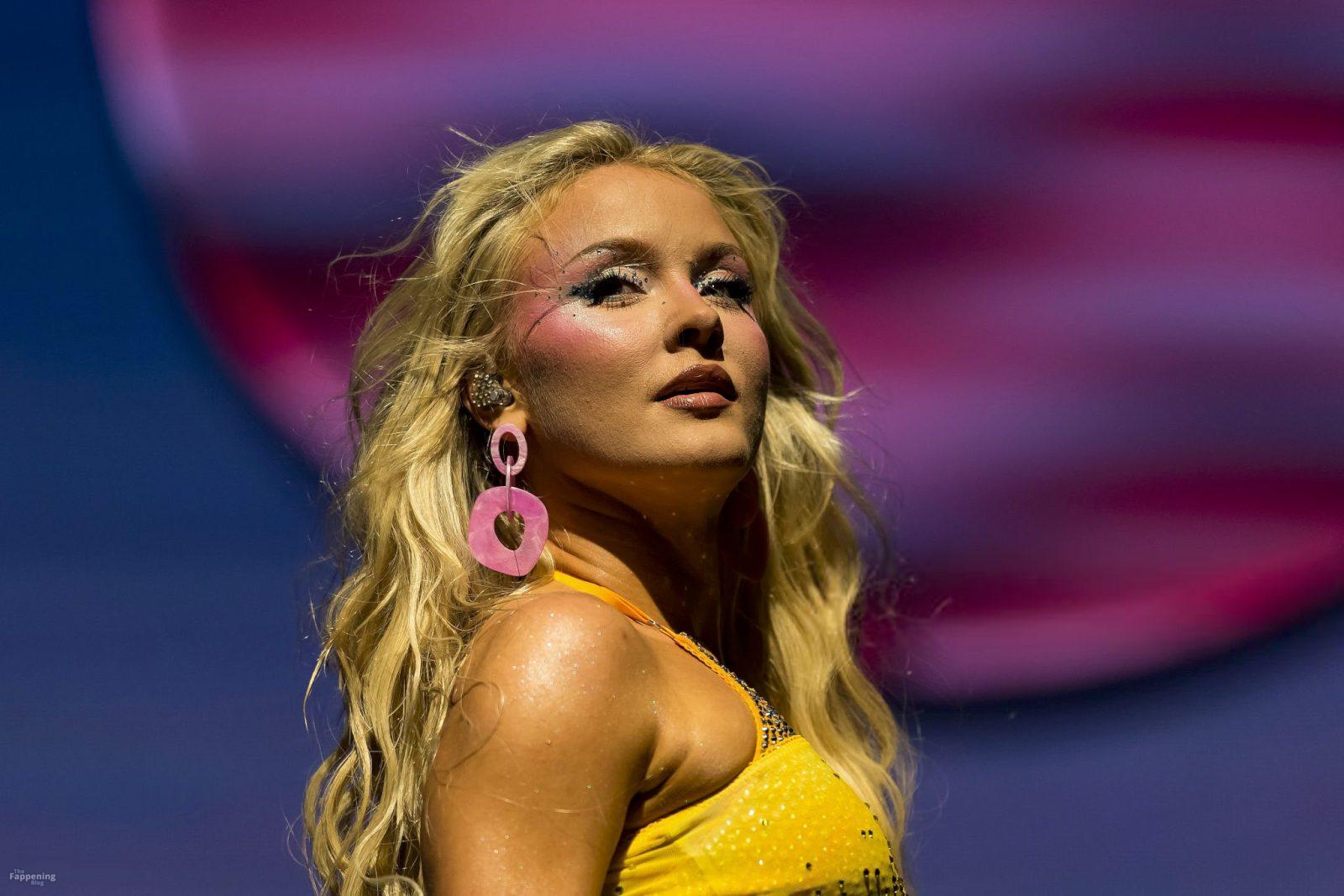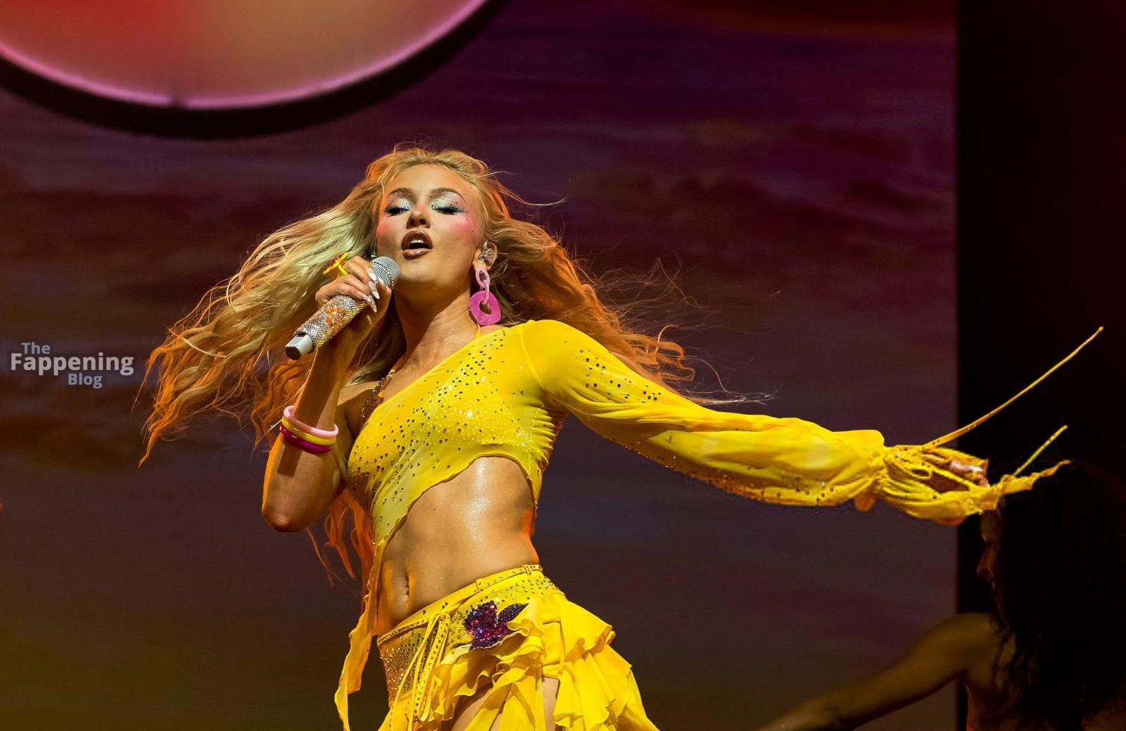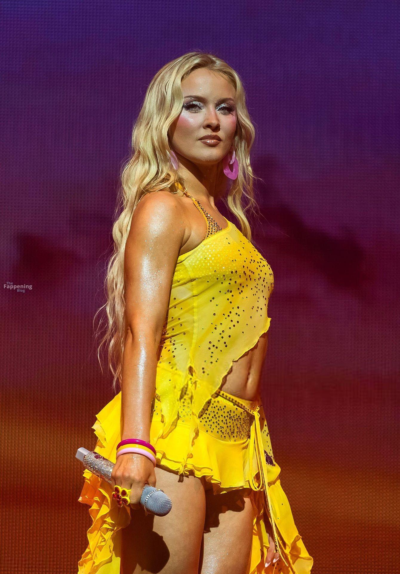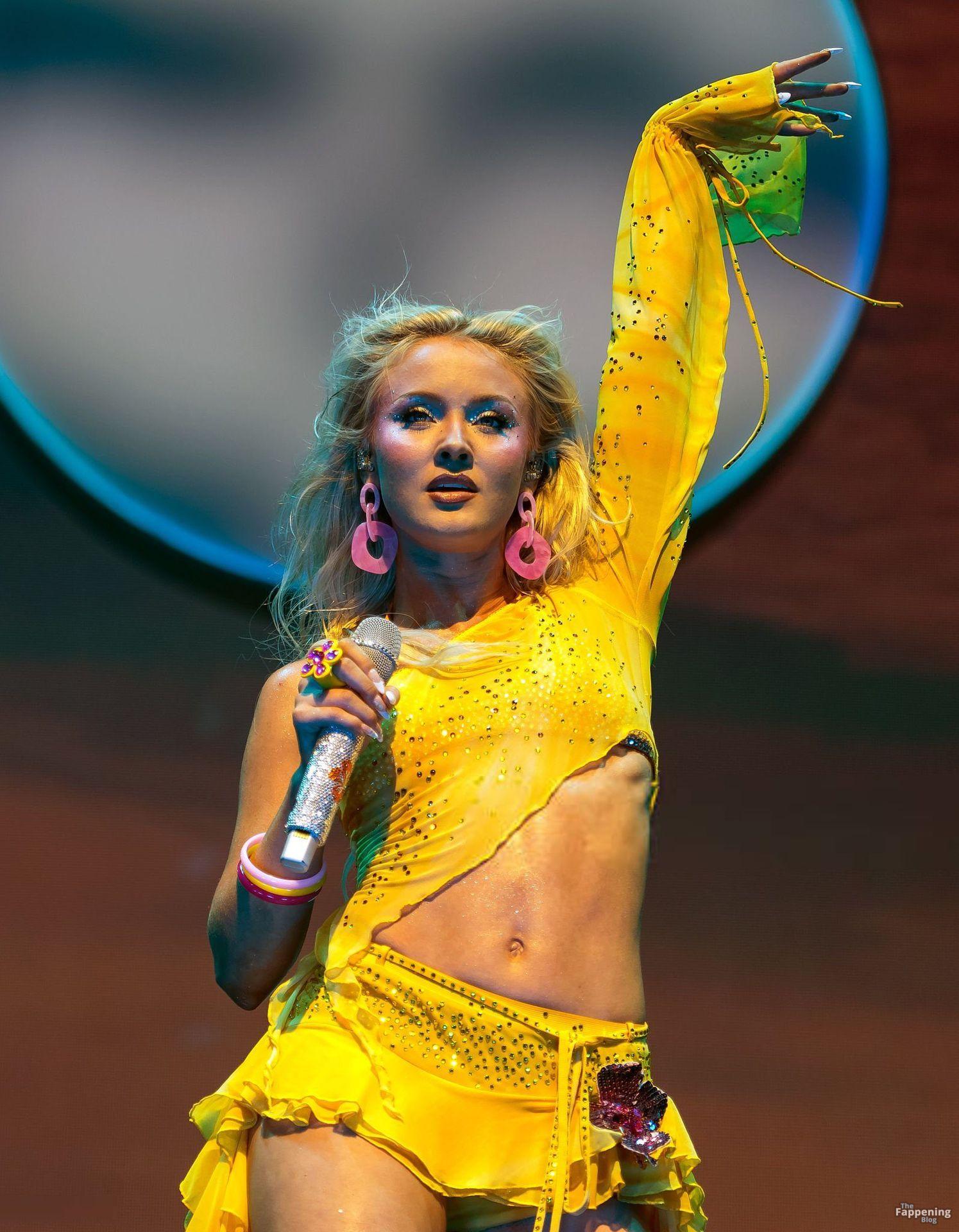 Zara Larsson hit the OVO Arena Wembley stage in a sheer yellow crop top and mini skirt that showed off her abs and legs.