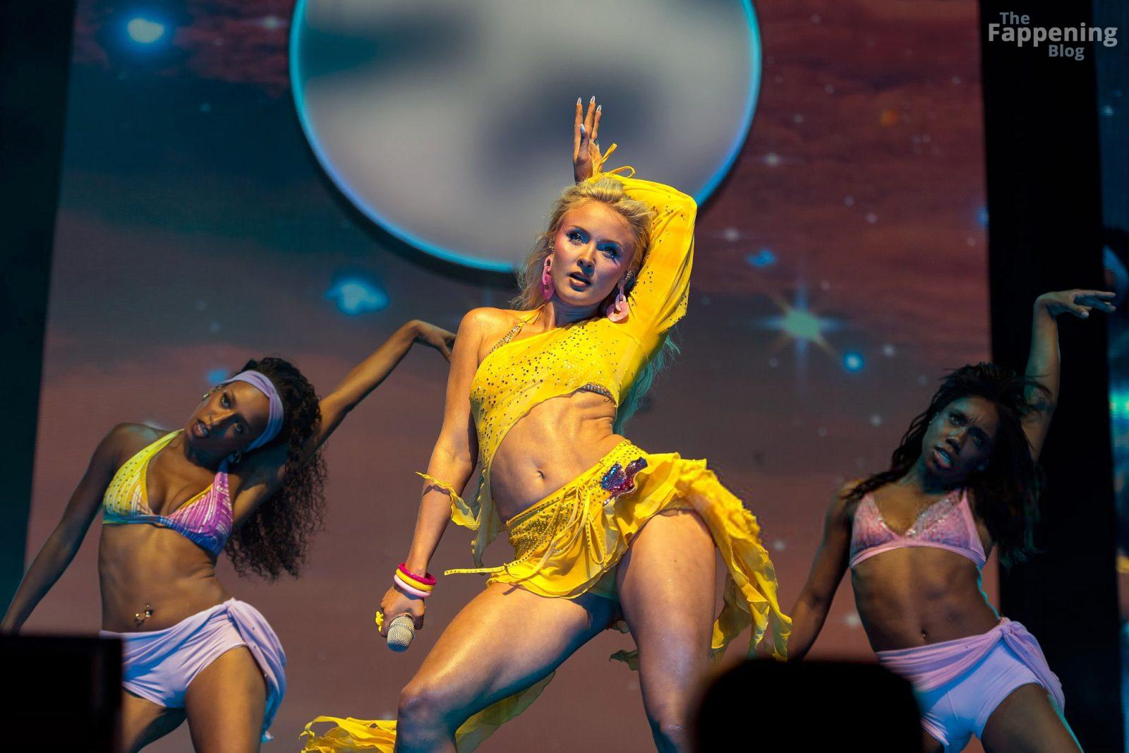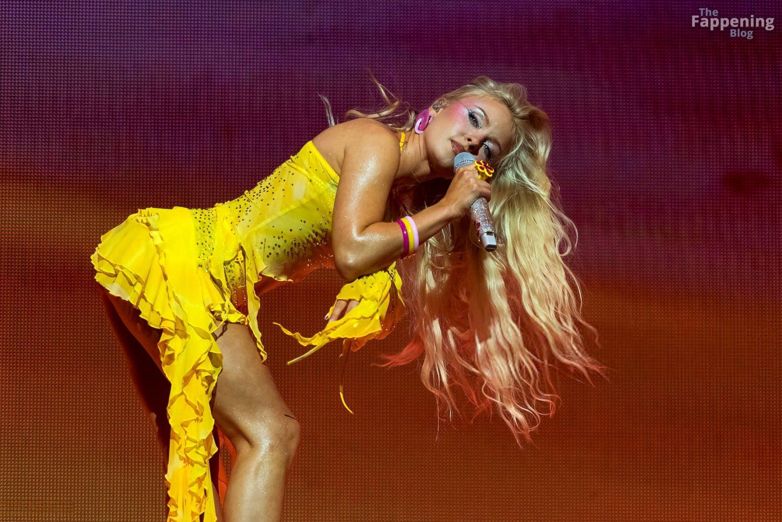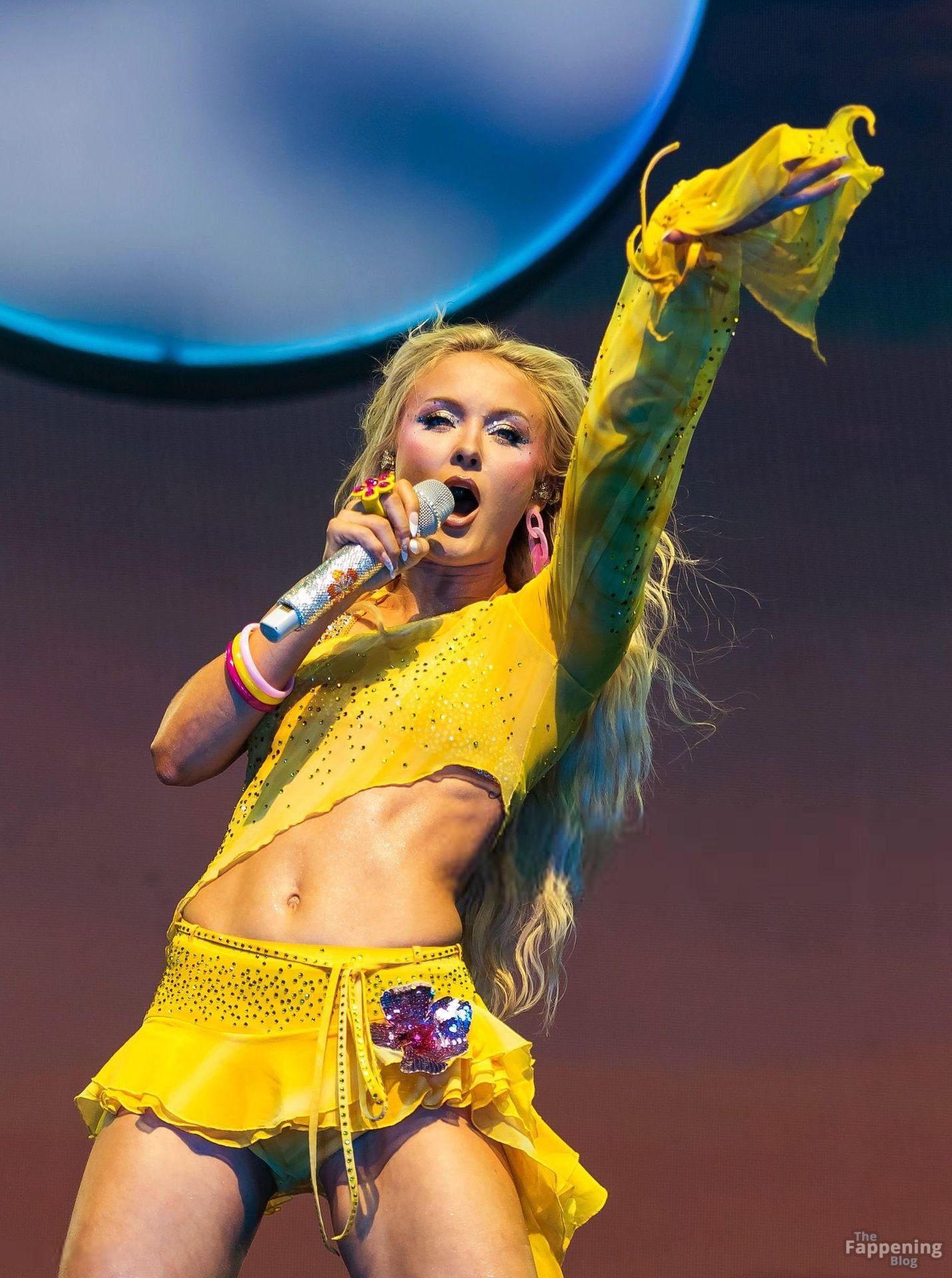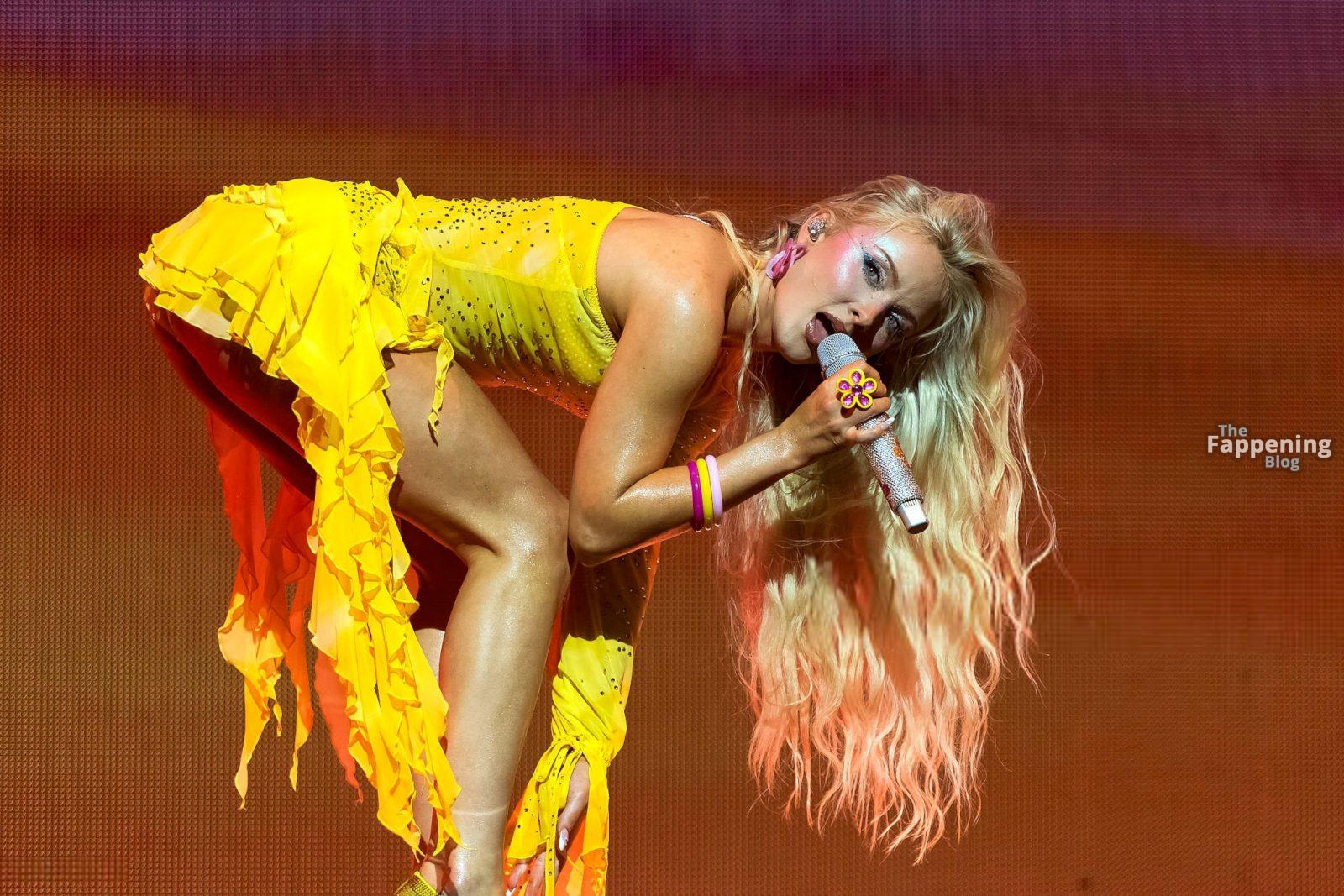 Zara Larsson hit the OVO Arena Wembley stage in a sheer yellow crop top and mini skirt that showed off her abs and legs.