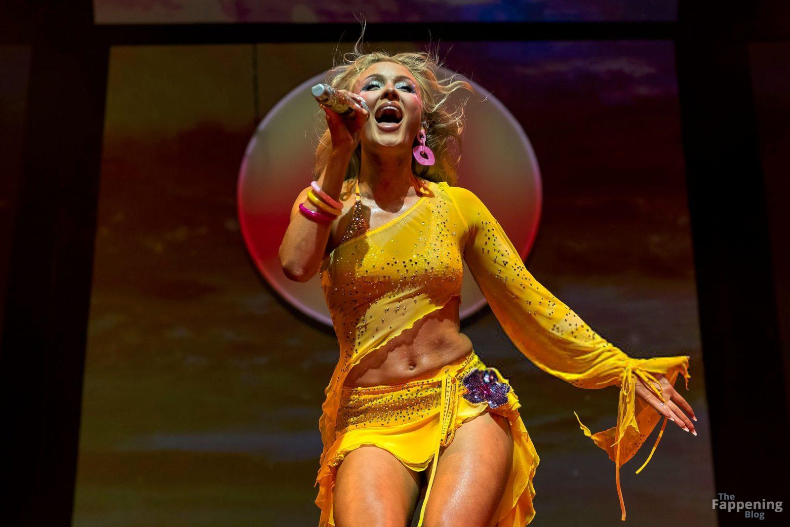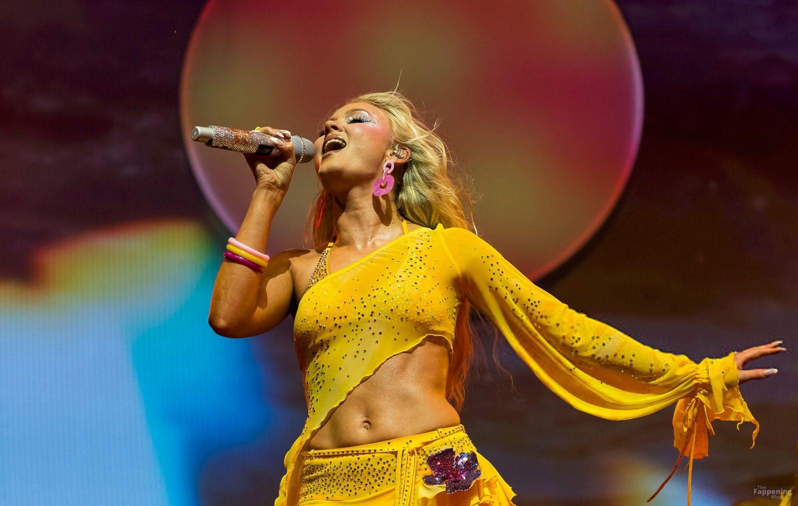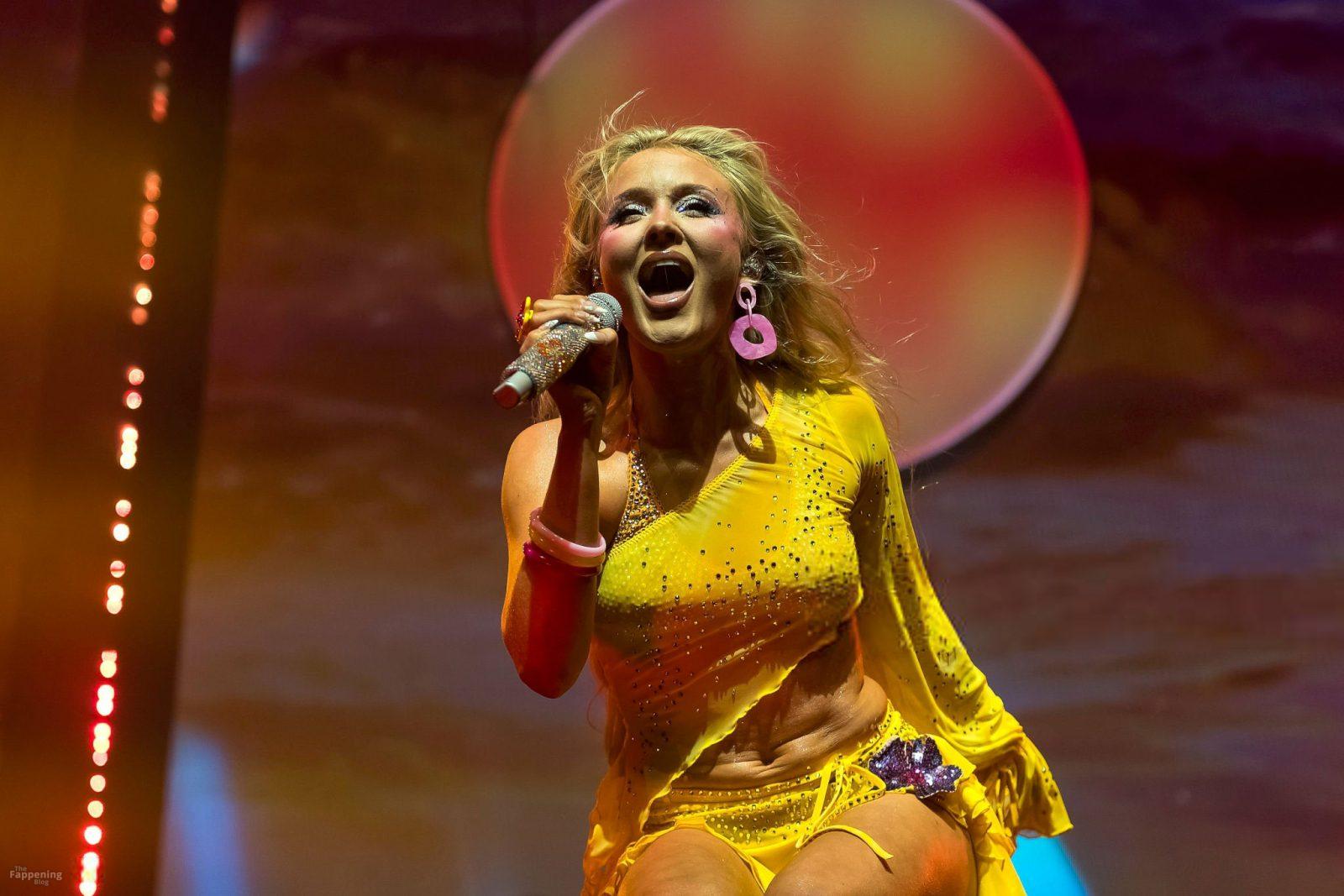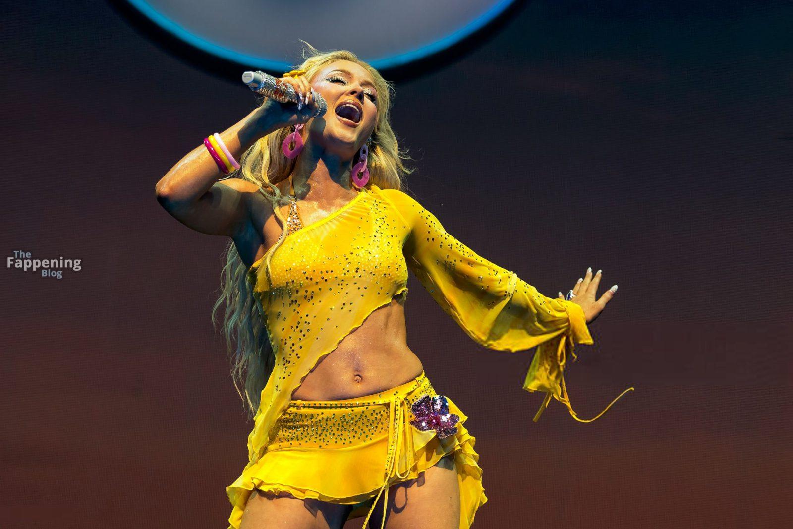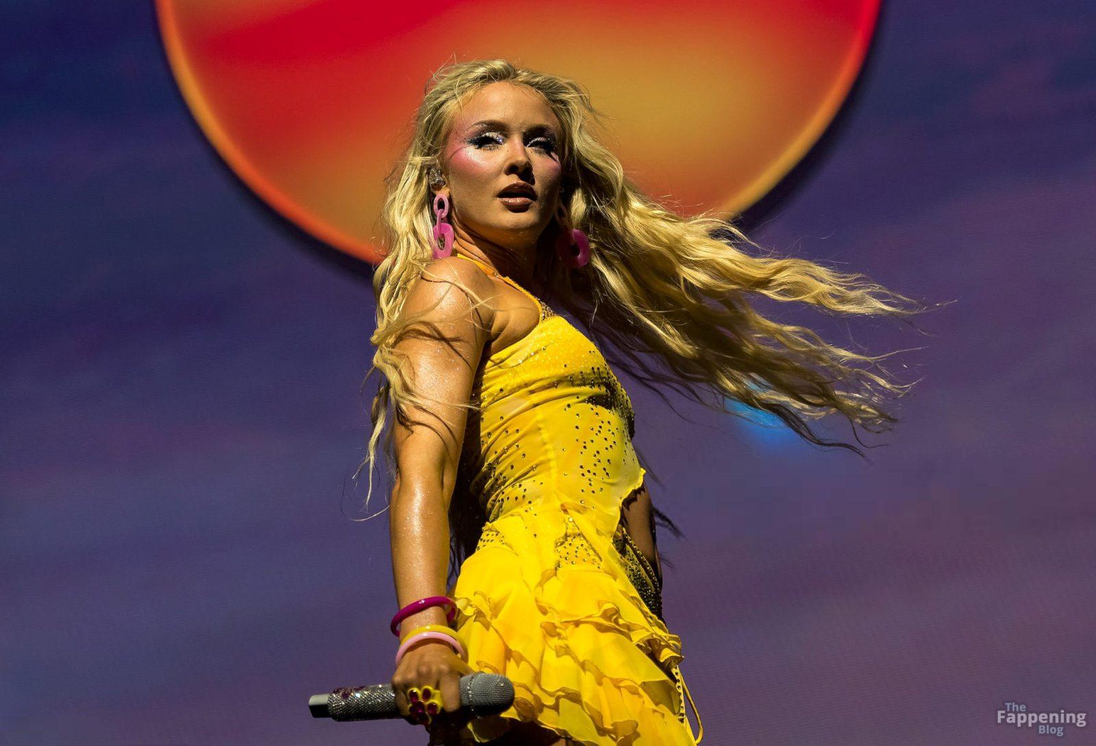 Zara Larsson hit the OVO Arena Wembley stage in a sheer yellow crop top and mini skirt that showed off her abs and legs.
