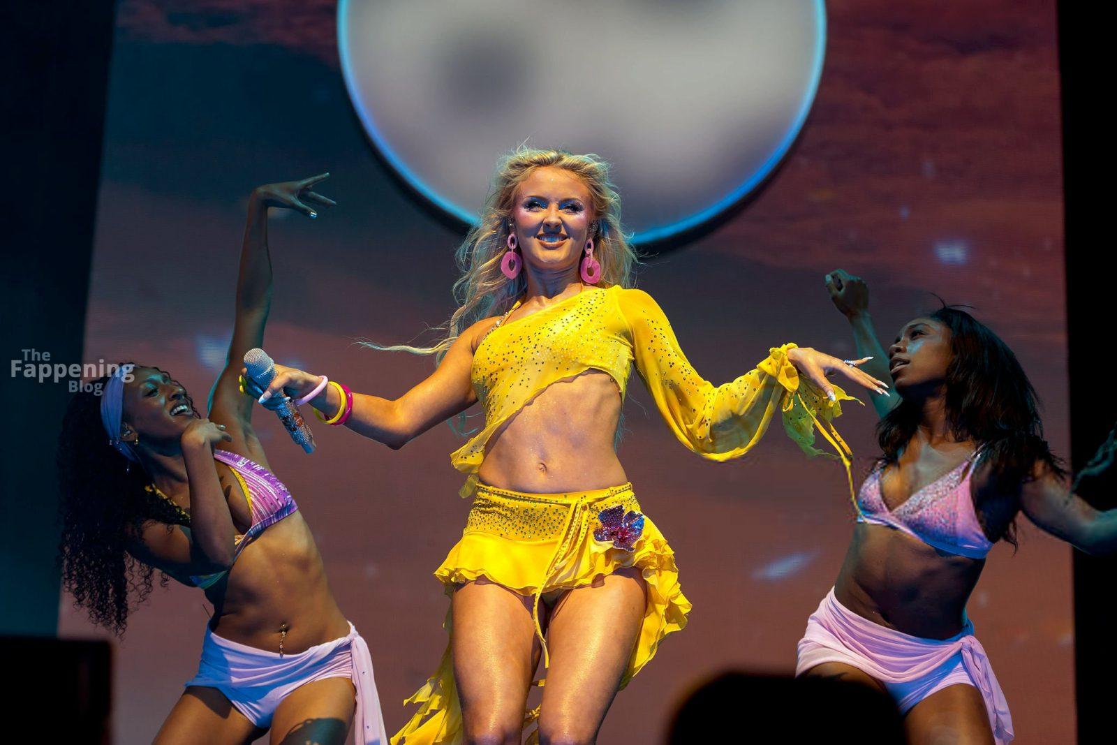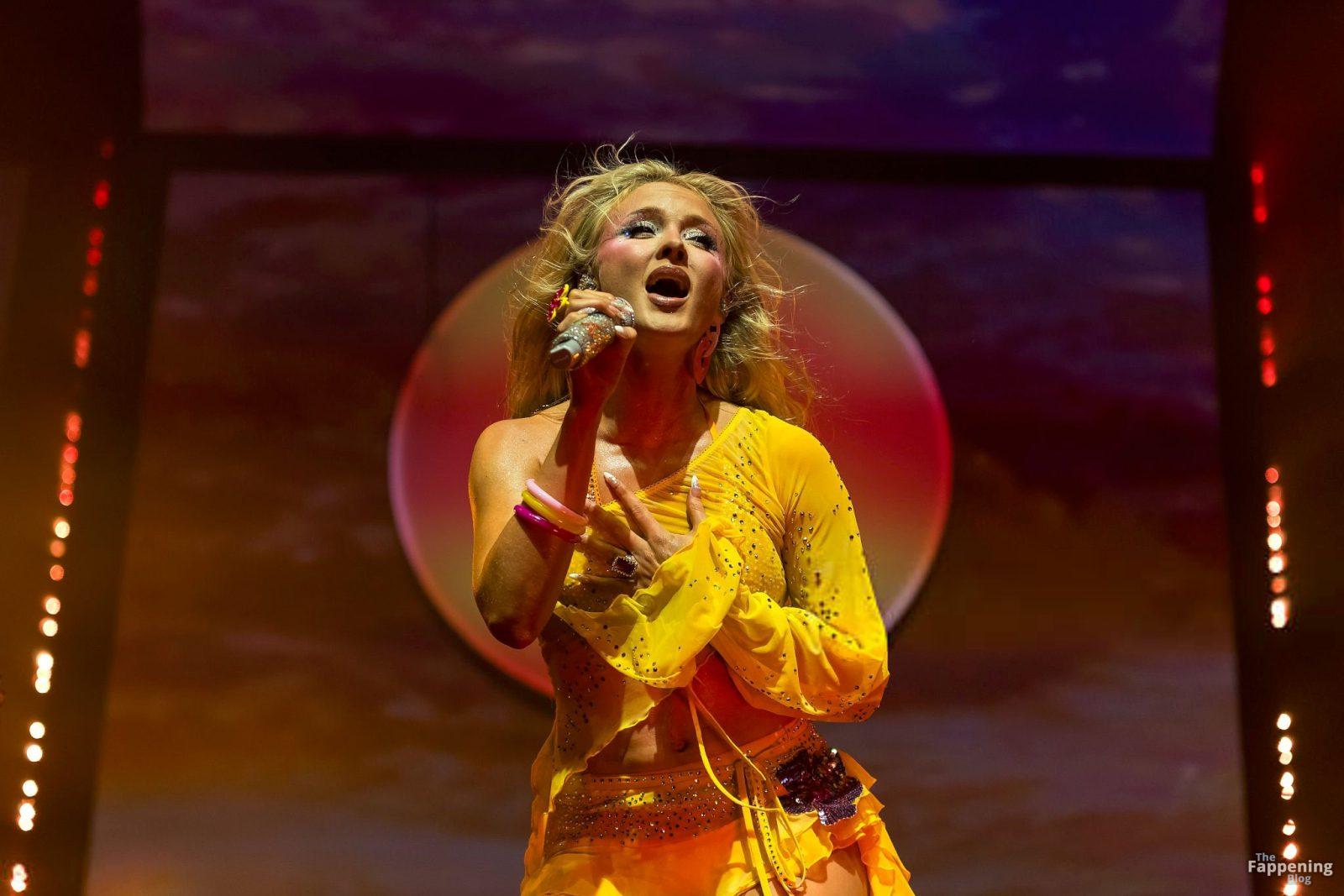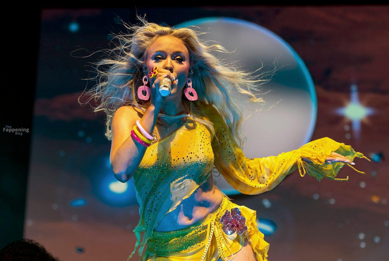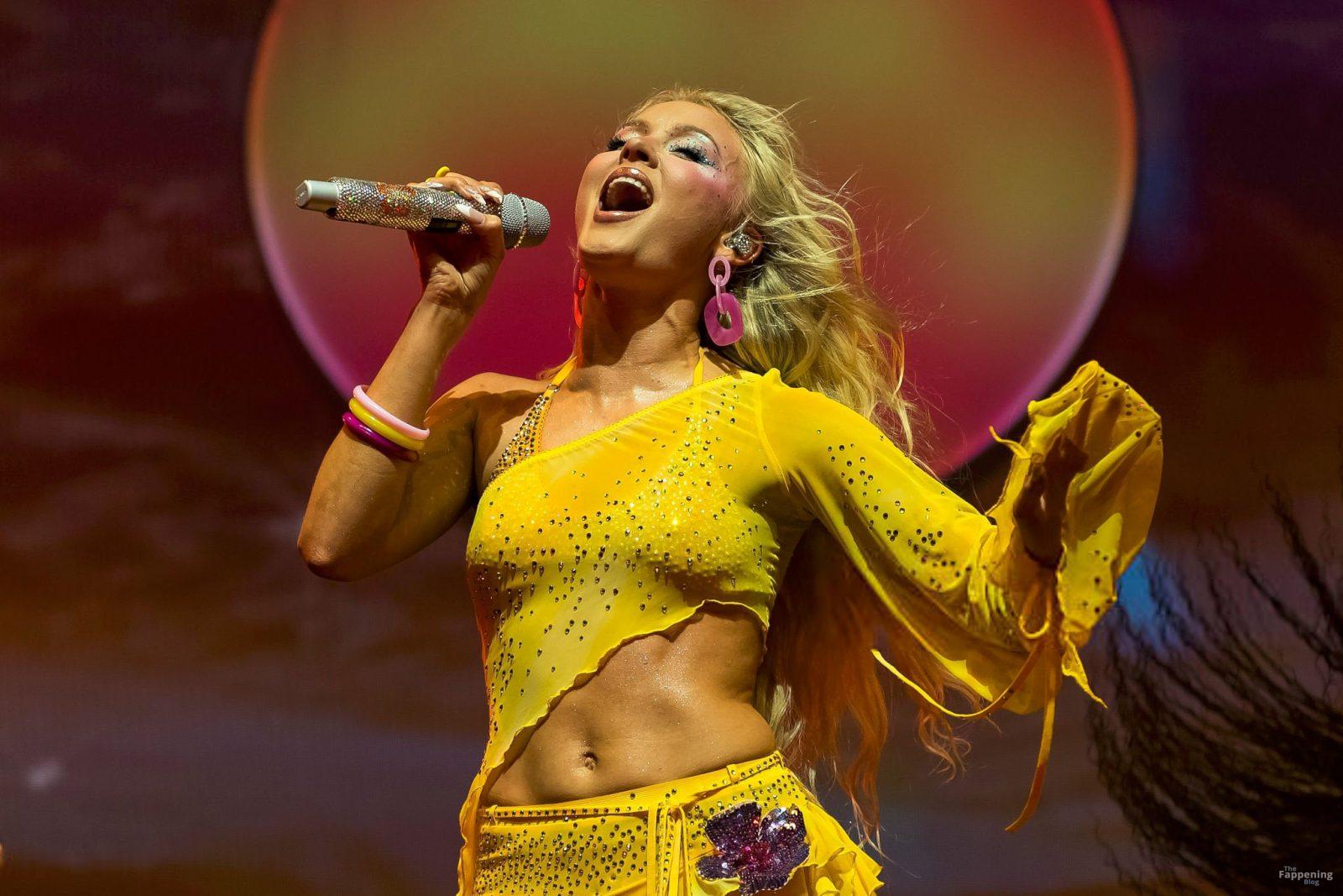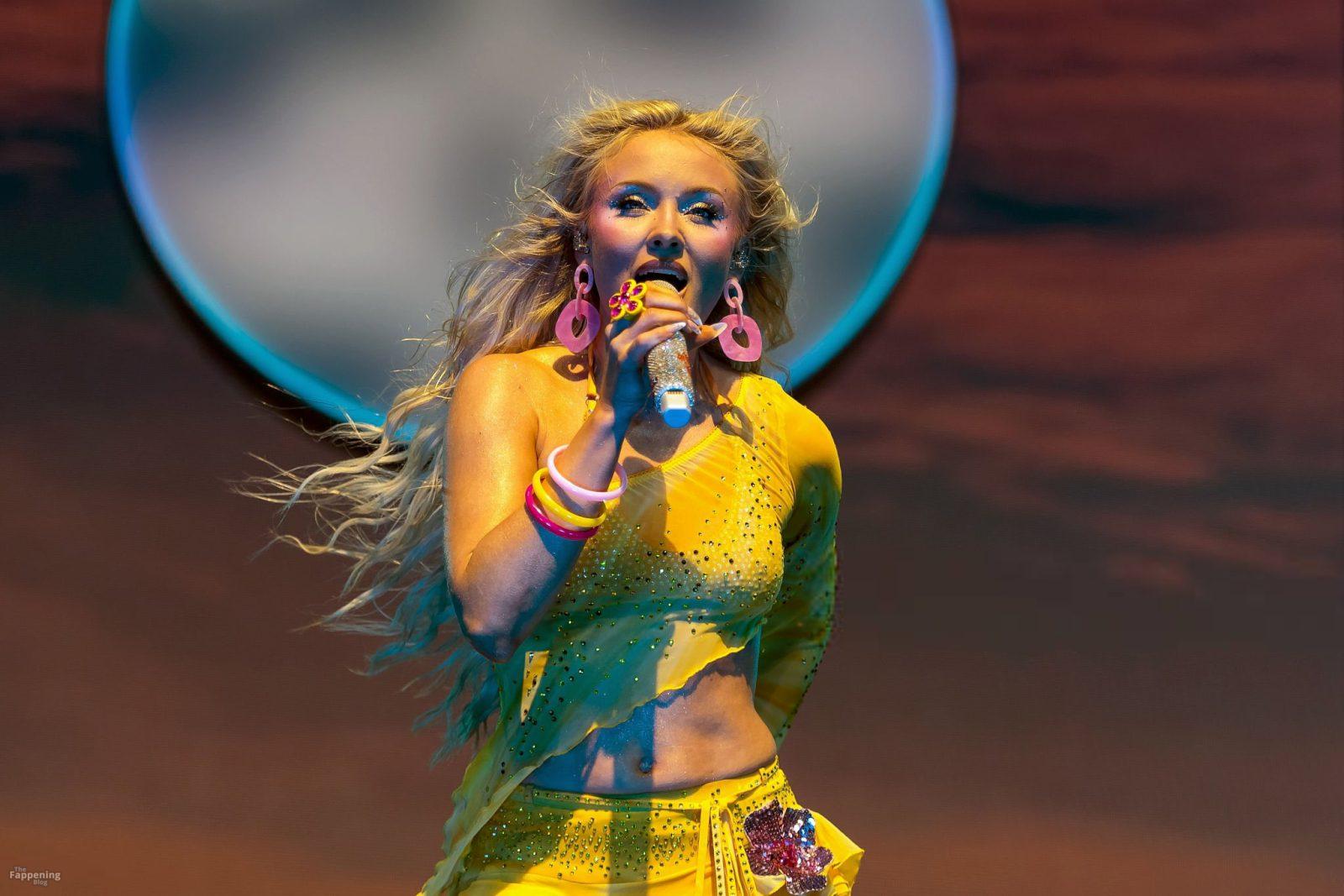 Zara Larsson hit the OVO Arena Wembley stage in a sheer yellow crop top and mini skirt that showed off her abs and legs.