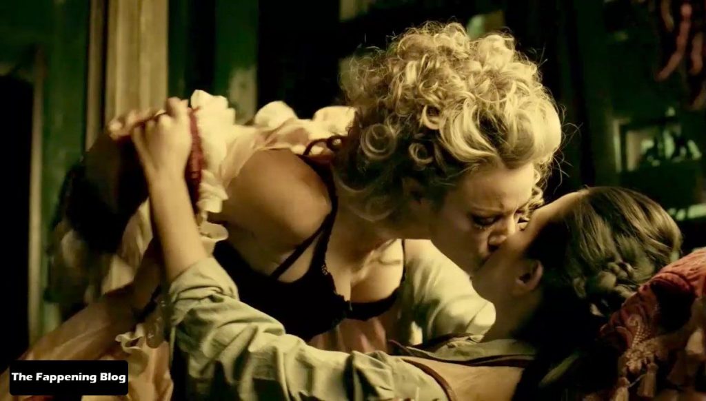 Zoie Palmer is lesbian kissing Anna Silk and then climbing on top of Anna on a bed kissing her some more as they remove her dress to reveal a black bustier and then flipping over with Anna on top as they remove Anna’s shirt to reveal the side of her large right breast before they start having sex with Anna looking into the mirror and realizing that she’s in the body of a man, and that Zoie thinks she’s having sex him and not her, all while giving us some looks at the sides of Zoie’s breast and body.